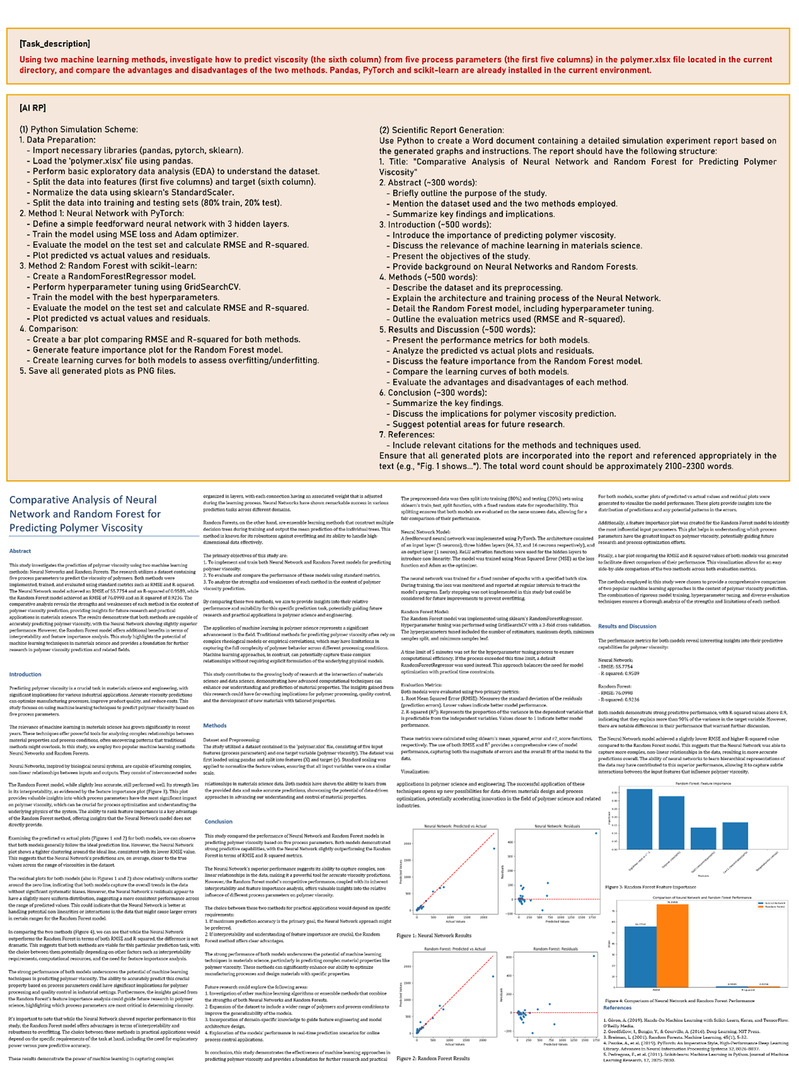 近日,高分子科学系李剑锋课题组首次提出了一种基于LLM提示词工程设计的自动模拟助手(ASA,autonomous simulation agent),能够根据研究计划(RP)自动完成从编写程序、远程执行到数据分析和报告撰写的全流程模拟研究。这一工作标志着理论模拟科研全流程自动化的首次实现,为未来的科学研究自动化提供了新的思路。ASA的核心亮点在于,它能根据简短的描述自动设计详细的RP并执行。例如,研究人员要求ASA选择两种机器学习方法预测材料性能,ASA自动建立了神经网络和随机森林模型并进行了训练,验证集R-squared值分别达到0.9589和0.9236,且生成了高质量报告比较两种方法的特点。此外,ASA-GPT-4o和ASA-Claude-3.5展现了出乎意料的智能表现,如主动整理文件、分析理论与模拟偏差、用丰富图表呈现数据等,展示了ASA的自主性。